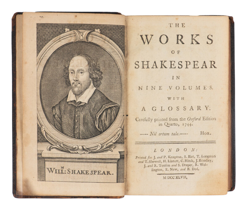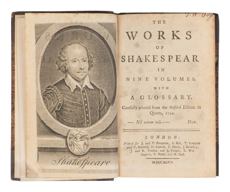 [With:] SHAKESPEARE. The Works of Shakespear...with a glossary. Carefully printed from the Oxford Edition in Quarto, 1744. Sir Thomas Hanmer, editor. London: Printed for J. and P. Knapton, et al, 1747. 9 volumes, 12mo in sixes (133 x 83 mm). 2 engraved plates in vol.1, including a portrait frontispiece of Shakespeare. (Some marginal toning.) Contemporary calf, spines in 5 compartments with 4 raised bands, gilt-numbering in one (covers worn, some splitting to joints). Provenance: Brent Gration-Maxfield (ownership signature in vol.1 on pastedown). Another copy, but with altered portraits of Shakespeare and the Westminster monument. This set was available in both variations (with these two engravings or with the expanded 38 engravings). Jaggard, p.500.