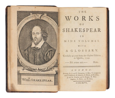 SHAKESPEARE, William (1564-1616). The Works of Shakespear...with a glossary. Carefully printed from the Oxford Edition in Quarto, 1744. Sir Thomas Hanmer, editor. London: Printed for J. and P. Knapton, et al, 1747.