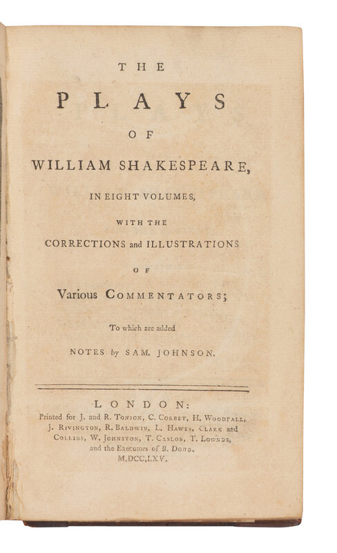 SHAKESPEARE, William (1564-1616). The Plays. Samuel JOHNSON (1709-1784), editor. London: J. and R. Tonson, et al., 1765.