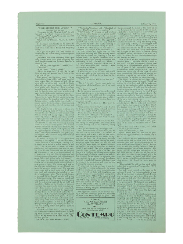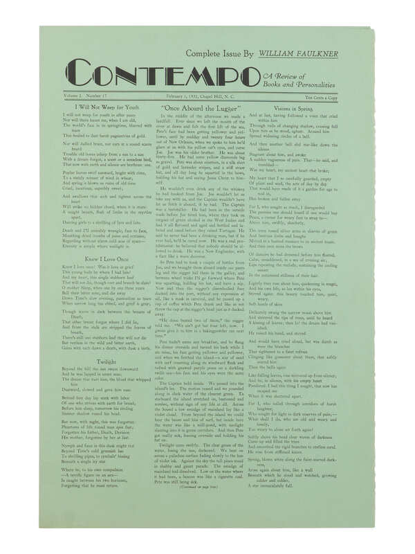 [With:] Contempo. Vol.1, No. 17. Chapel Hill, N.C., 1 February 1932. Large folio. 2 issues, one printed on green paper and the other printed on white paper. Contains an advertisement for a free copy of Faulkner's Sanctuary with a yearly subscription to Contempo.