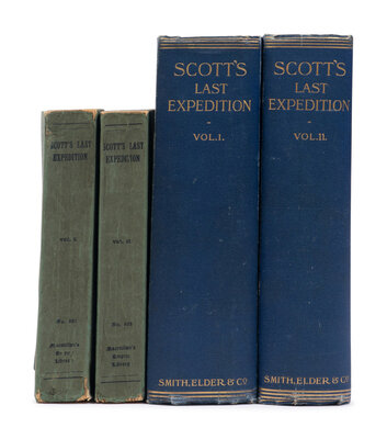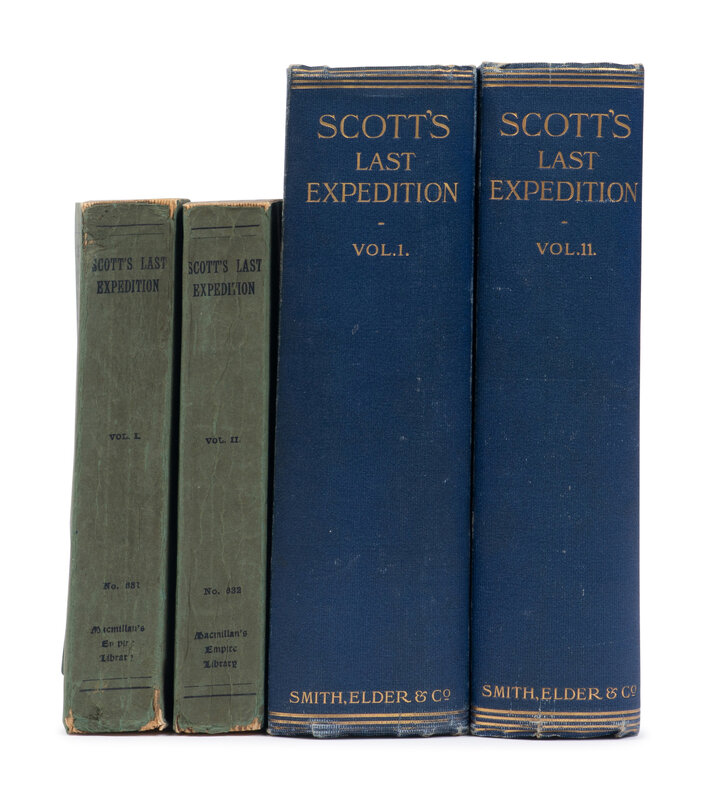 [With]: SCOTT. Scott's Last Expedition: In Two Volumes [etc.]. London: Macmillan & Co., Limited, 1913. 2 volumes, 8vo. 2 folding maps, 8 photographs (some very minor spotting, some corners creased). Original printed wraps (minor sunning to spines). Issued in the Macmillan Empire Library series. “This edition is intended for circulation only in India and the British Dominions over the Seas.” First reduced size edition, considerably more scarce than the first edition. Rosove 290.C1b; Renard 1397.