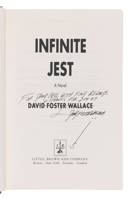 FIRST EDITION, second printing, of Wallace's postmodern encyclopedic novel, which employs an unconventional narrative structure and an experimental use of endnotes (some 388 in all). INSCRIBED BY WALLACE on the title-page: "For David Bell with fond regards & thanks for 2-9-97, David Foster Wallace."
