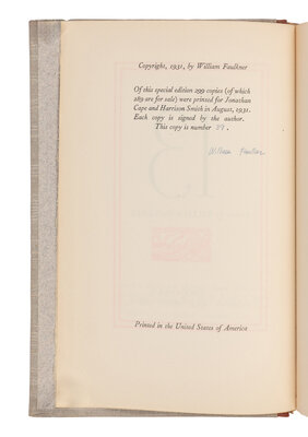 FIRST EDITION, LIMITED ISSUE, number 39 of 299 copies, SIGNED BY FAULKNER. “It is likely that the limited issue precedes the trade issue” (Petersen). These 13 is a collection of stories, dedicated to his first daughter, Alabama, who had died nine days after her birth on 11 January 1931. It contains the first appearance of his story “A Rose for Emily.” Petersen A9.1.