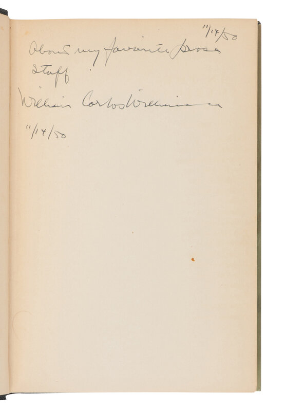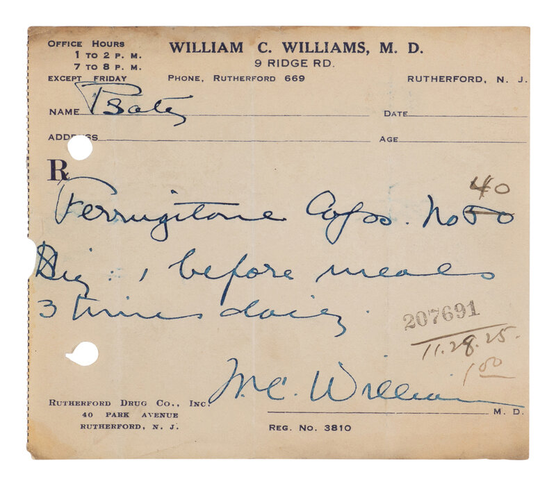 [With:] autograph document signed ("W.C. Williams"), as M.D., 1p., oblong 16mo. WILLIAMS FILLS A SCRIPT FOR A PATIENT. Williams was a family doctor in Rutherford, New Jersey, for over 40 years. He often wrote between patient visits, seeing medicine and writing as two parts of helping people.