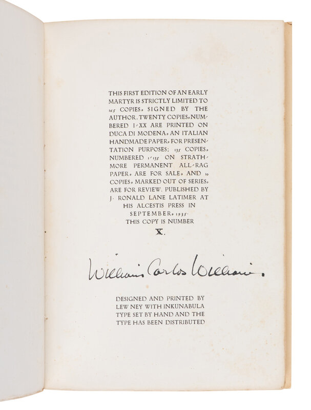 FIRST EDITION, LIMITED ISSUE, roman numeral number "X" of 20 copies printed on handmade Italian paper, for presentation purposes, SIGNED BY WILLIAMS, from a total edition of 165. Wallace A16.