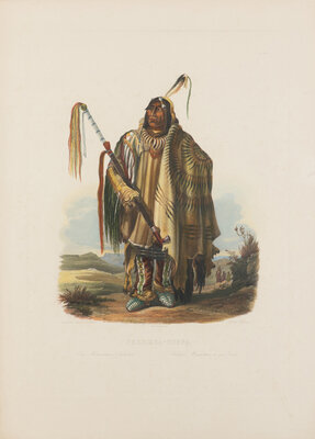 From Travels in the Interior of North America, Coblenz, Paris, and London, 1839-1842. Aquatint engraving with hand-coloring by Legrand after Bodmer, Bodmer blindstamp lower margin, title in French, German and English, 622 x 451 mm, light spotting, few short closed tears near lower margin.
