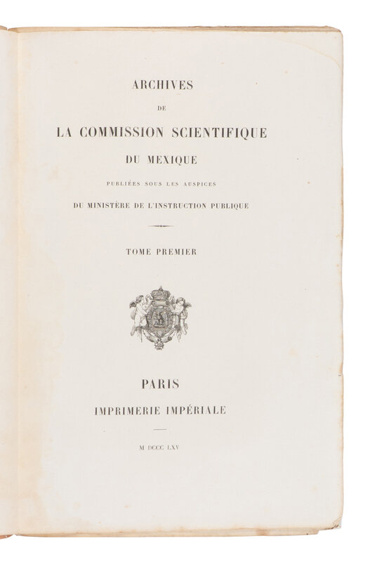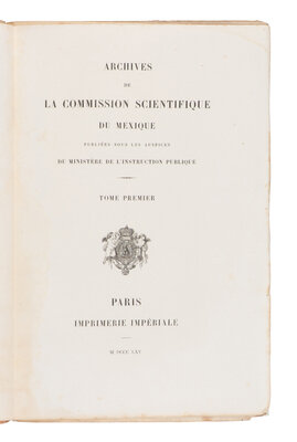 Other notable contributions include the 1865 ascent of Mt. Popocatépetl by Auguste de Dollfus; an exploration of Casas Grandes (140 miles southwest of El Paso), where a meteorite weighing 3,407 pounds was studied. Because two scientists first landed in California, the reports also cover mining in California and the American West. Volume II (fasc. 4) includes Guillemin-Tarayre’s notes on mines in Lower and Upper California; Volume III (fasc. 2) contains his “Notes Archéologiques et Ethnographiques” on Mexican linguistics and Native Americans in New California, New Mexico, and the Borderlands. Palau 15651; Sabin 48286.