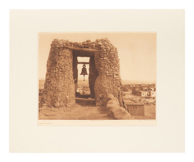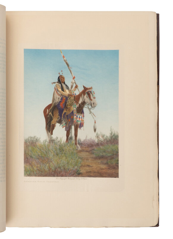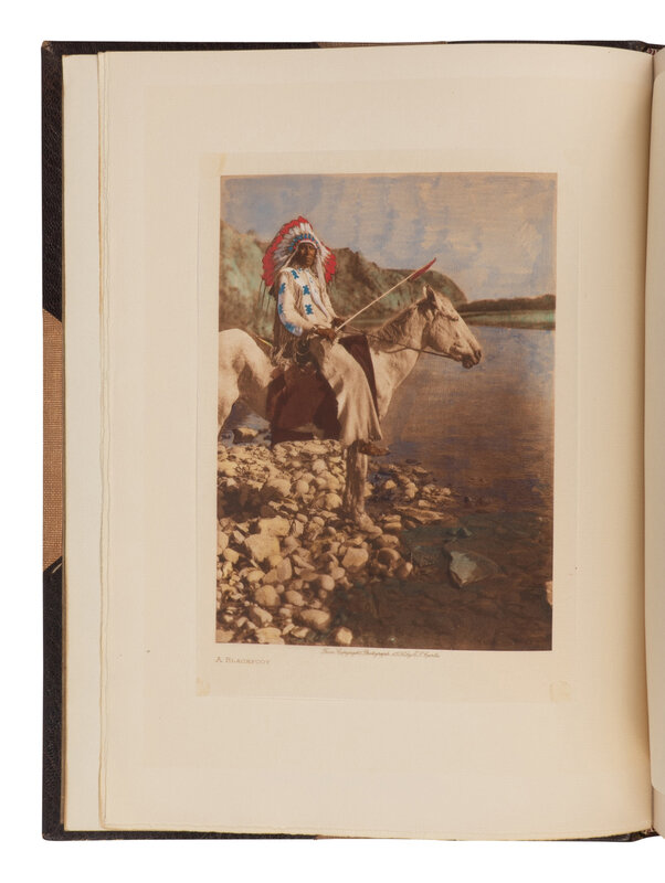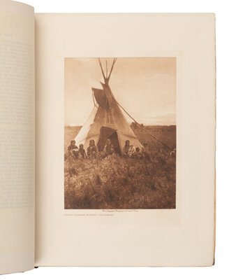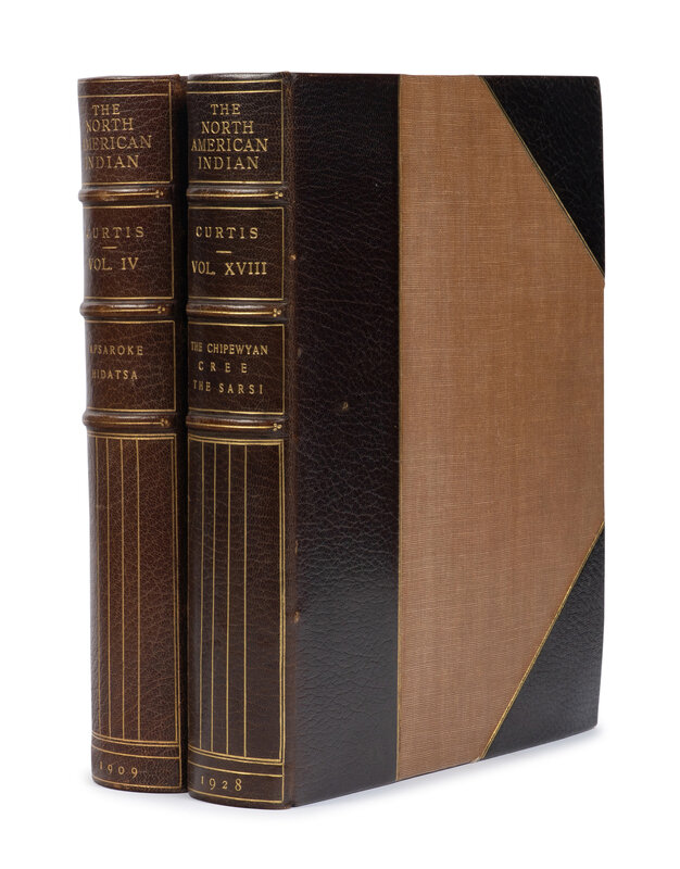 [With:] The North American Indian being a Series of Volumes Picturing and Describing the Indians of the United States and Alaska. Edited by Frederick Webb Hodge. Foreword by Theodore Roosevelt. Field Research conducted under the patronage of J. Pierpont Morgan. Vol. IV and Vol. XVIII. Norwood, Massachusetts: The Plimpton Press, 1909, 1928. 2 text volumes, 4to (316 x 240 mm). 148 (74 and 74) photogravures PRINTED ON JAPAN VELLUM, several hand-colored in gouache (minor toning from tissue guards throughout). Original brown half morocco gilt, top edges gilt, others uncut, stamp-signed by H. Blackwell and Whitman Bennett. LIMITED EDITION, both numbered 239 of 500 proposed sets (but probably only 272 sets produced). ONLY 30 OF THESE SETS WERE PRINTED ON JAPAN VELLUM.