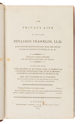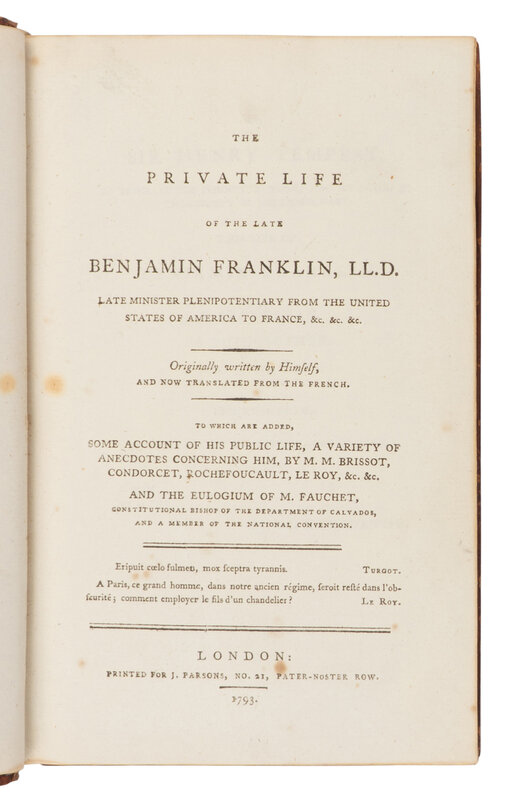 FRANKLIN, Benjamin (1706-1790). The Private Life of the Late Benjamin Franklin, LL.D...Originally Written by Himself and Now Translated from the French. London: Printed for J. Parsons, 1793.