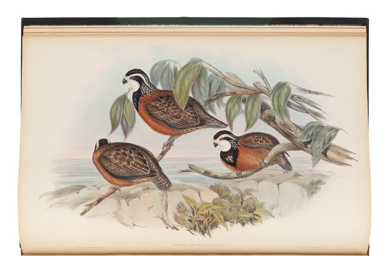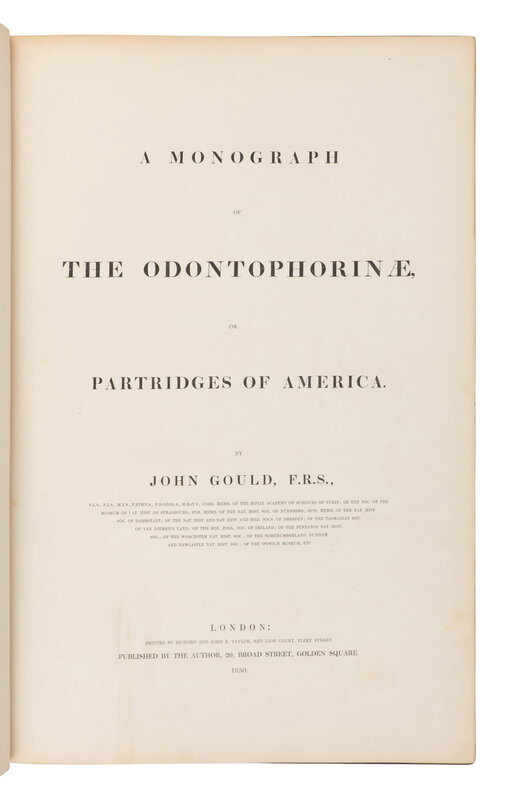 FIRST EDITION OF GOULD'S FIRST MONOGRAPH ON GAME BIRDS. The monograph, dedicated to Charles Lucien Bonaparte, was Gould's fourth and featured illustrations of birds in mating pairs, a format that had already garnered considerable success. To create this work, Gould visited bird collections across France, Germany, Switzerland, and the Netherlands. He added around twenty-four new species to the eleven American partridges previously known, many of which were illustrated and described for the first time in this volume. In the preface (p.9), Gould says that he was drawn into the undertaking "by the sight of the beautiful Callipepla Californica, presented to the Zoological Society of London by Captain Beechey, in 1830." Anker 176; Ayer/Zimmer p.257; Fine Bird Books, p.102; Nissen IVB 376; Sauer 13; Wood, p.365.