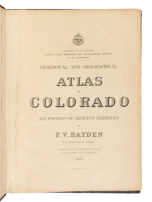 HAYDEN, Ferdinand Vandeveer (1829-1887). Geological and Geographical Atlas of Colorado and Portions of Adjacent Territory. Washington D.C. and New York: Department of the Interior United States Geographical Survey; Julius Bien & Co., 1881.