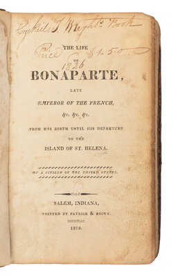 [INDIANA IMPRINT]. The Life of Bonaparte, Late Emperor of the French, From his birth until his departure to the Island of St. Helena by a citizen of the United States. Salem, IN: Patrick & Booth, 1818.