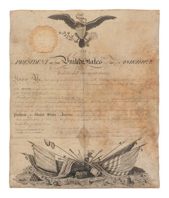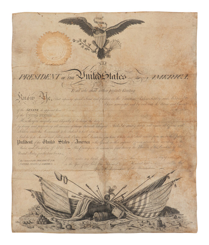 1 page, on vellum, folio (457 x 368 mm), accomplished in manuscript, with cream-colored seal intact at upper left, engraved by I. Draper, paper transfer from old adhesive board (since removed) on verso, old creases, a few spots of dampstaining slightly affecting Jefferson's signature, overall toning and soiling.