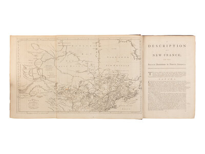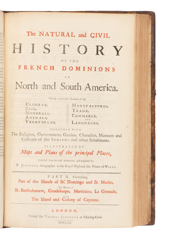 FIRST EDITION. "A monumental geographical work important equally for its text as well as its maps" (Streeter). The first part describes Canada and Louisiana, and France's troubles with the indigenous peoples. The second part provides a close look at the island territories of the French West Indies, including Martinique, Hispaniola, Guadaloupe, and other smaller islands. This issue contains the seldom found seven pages (pp.*129-*142 in part 1 ["The French attempt to retake Quebec"]) and the errata slip on p.80 in part 2 containing the parish names of Guadaloupe and Grande Terre. Howes J-83; Lande 471; Sabin 35964; Streeter sale 1:128; Staton & Tremaine 319.
