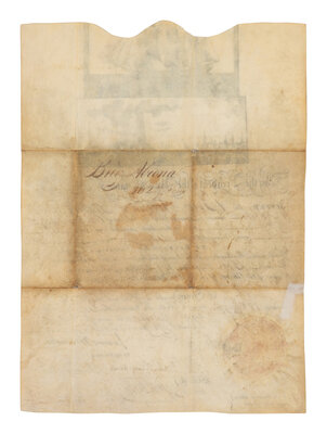1 page, on vellum, folio (367 x 265 mm), accomplished in manuscript, scalloped edge at top, paper seal, docketed verso, creased from folding, some soiling, "o" of "Monroe" affected slightly by one fold. Ship's passport for the brig Abeona of New York with William H. Nichols as master of commander of the ship with seven men and no guns to pass "without any hinderance, seisure or molestation."