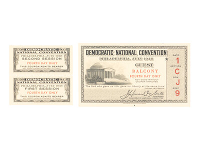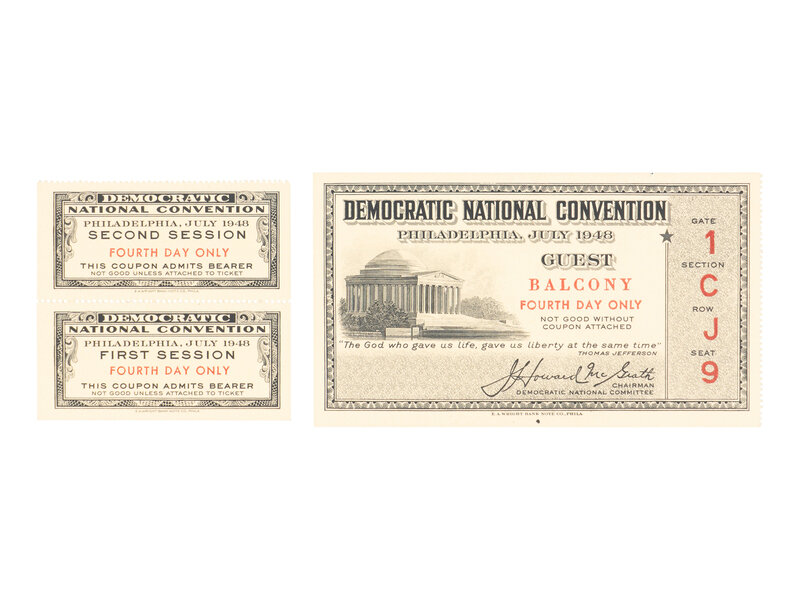 [With]: A binder of materials relating Truman which includes: 5 TLS from Truman to various persons including former Secretary of the Treasury John W. Snyder in response to Snyder's telegram of congratulations upon the birth of Truman's first grandchild; historian David Lowenthal in response to his gift of a facsimile Gettysburg Address to Truman's presidential library; and to Barbara Huber of Princeton University Press in thanks for a book about the Potsdam Conference. Additionally, there are three tickets to the 1948 Democratic National Convention, a letter from Lyndon Johnson as senator dated 20 January 1960 (likely secretarial signature); and a ticket to a Kennedy for President Rally dated 22 October 1960 at the Municipal Auditorium in Kansas City, Missouri.