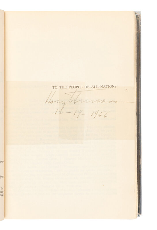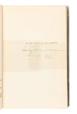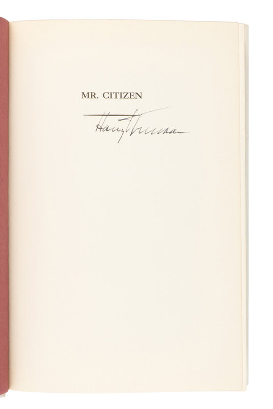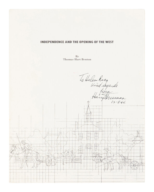 TRUMAN. Memoirs by Harry S. Truman: Year of Decisions. Garden City, NY: Doubleday & Company, 1955. 1 (of 2 volumes) only, 8vo. Original cloth; dust jacket. FIRST EDITION. SIGNED BY HARRY TRUMAN. -- TRUMAN. Mr. Citizen. New York: Bernard Geis Associates, 1960. 8vo. Original cloth; dust jacket. SIGNED BY TRUMAN. -- TRUMAN. Invitation to the 1949 presidential inauguration of Harry S. Truman and Alben W. Barkley issued to Joseph Mailman of New York City. -- BENTON, Thomas Hart (1889-1975). Independence and the Opening of the West. Independence, MO: Harry S. Truman Library, 1961. 4to. Original wrappers. INSCRIBED BY HARRY TRUMAN TO HELEN RACY, "With kind regards."