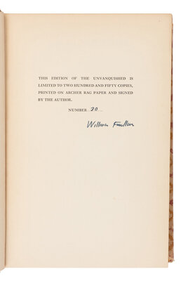FIRST EDITION, LIMITED ISSUE, number 30 of 250 copies on Archer rag paper, SIGNED BY FAULKNER. The Unvanquished comprises seven short stories, five of which were originally published in The Saturday Evening Post. Petersen A19.1.