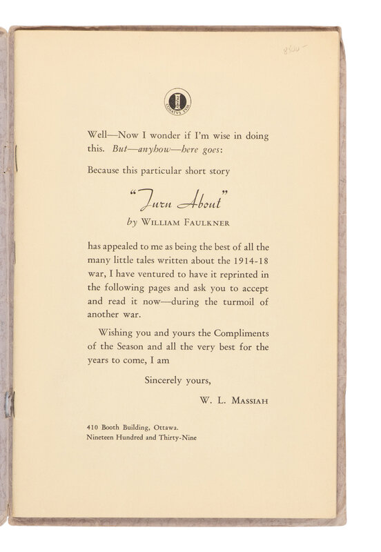 THE PUBLISHER'S COPY OF THE FIRST SEPARATE PUBLICATION: "BY FAR THE RAREST OF FALKNER'S PUBLISHED BOOKS." Turn About was first published in the 5 March 1932 issue of The Saturday Evening Post and was subsequently published, with some variation, in the annual collection of O. Henry Memorial Award Prize Stories of 1932 and in Doctor Martino (1934). This separate publication "came into existence as a result of the Second World War. Hitler ordered the invasion of Poland on September 1, 1939; England and France entered the war on September 3. On September 10 the Dominion of Canada was at war with the German Reich. Poland fell before the end of the month and the western front settled into the stagnation of the Phony War. In this unhappy period Canadian businessman W.L. Massiah, inspired by the qualities of courage portrayed by Faulkner's characters, published Turn About in pamphlet form as a holiday greeting. There is some uncertainty concerning the publication arrangements. In 1939 Random House was Faulkner's publisher; Massiah instead thanks Smith and Haas for permission to reprint 'through their agents MacMillan and Co., of Canada Limited.' The text he prints is not the Doctor Martino version published by Smith and Haas but the 'mustache' text of The Saturday Evening Post. It thus seems likely the printer used Post tear sheets for his setting copy" (Carl Petersen, On the Track of the Dixie Limited: Further Notes of a Faulkner Collector, La Grange, IL, 1979, p.29).