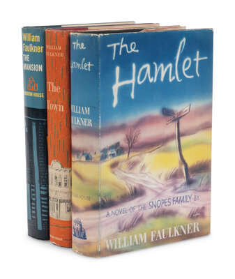 FIRST TRADE EDITIONS, IN FIRST ISSUE DUST JACKETS. The Snopes trilogy was begun in 1940 with The Hamlet and concluded nineteen years later with The Mansion, with all three works taking place in Faulkner's fictional Yoknapatawpha County, Mississippi. Petersen A22.1b, A47.1b, A52.1.
