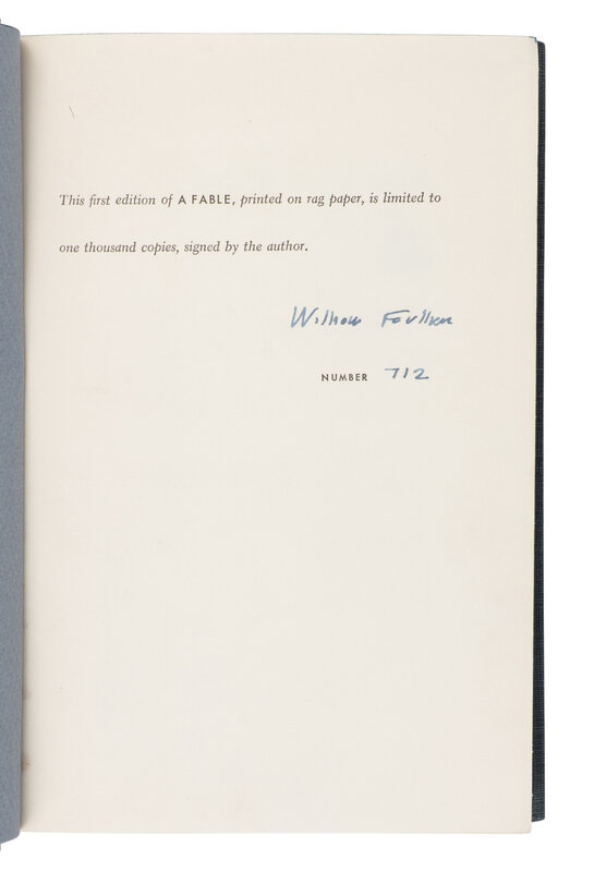 FIRST EDITION, LIMITED ISSUE, number 712 of 1,000 copies, SIGNED BY FAULKNER. A Fable was the first of Faulkner's novels to win the Pulitzer Prize. Though it was received with mixed reviews, Faulkner considered it his masterpiece, and it can be seen as a precursor to Joseph Heller's Catch-22. Petersen A37.2a.