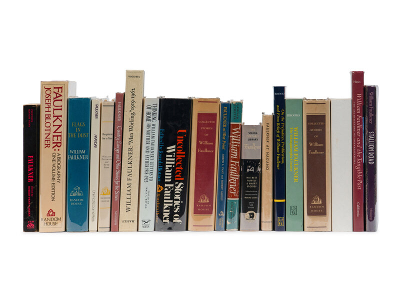 A Rose for Emily and Other Stories. [New York]: Editions for the Armed Services, Inc., 1942. -- The Faulkner Reader. New York: Random House, 1954. -- Requiem for a Nun: A Play. New York: Random House, 1959. -- Essays, Speeches, and Public Letters. New York: Random House, 1965. -- Flags in the Dust. New York: Random House, 1973. -- Mayday. Notre Dame and London: University of Notre Dame Press, 1978. -- Helen: A Courtship and Mississippi Poems. [New Orleans]: Tulane University and Yoknapatawpha Press, 1981. PRESENTATION COPY INSCRIBED BY EDITOR CARVEL COLLINS TO CARL PETERSON. -- Vision in Spring. Austin: University of Texas Press, 1984. -- Country Lawyer and Other Stories for the Screen. Jackson, MS: University of Mississippi Press, 1987. -- Stallion Road: A Screenplay. Jackson, MS: University of Mississippi Press, 1989. -- BLOTNER, Joseph. Faulkner: A Biography. New York: Random House, 1974. 2 volumes. -- BRODSKY, Louis Daniel and Robert W. HAMBIN. Faulkner: A Comprehensive Guide to the Brodsky Collection. Jackson, MS: University of Mississippi Press, 1982-1985. 4 volumes. VOLUMES I-III PRESENTATION COPIES INSCRIBED TO MALCOLM COWLEY. -- BROOKS, Cleanth. William Faulkner: Toward Yoknapatawpha and Beyond. New Haven and London: Yale University Press, 1978. PRESENTATION COPY INSCRIBED TO MALCOLM COWLEY. -- CAMPBELL, Harry Modean and Ruel E. FOSTER. William Faulkner: A Critical Appraisal. Norman, OK: University of Oklahoma Press, 1951. -- MASSEY, Linton R. (ed.). "Man Working", 1919-1962. Charlottesville: Bibliographical Society of the University of Virginia, 1968.