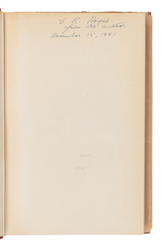 8vo. Original red burlap, printed paper labels on cover and spine (spine lightly toned); price-clipped dust jacket (front panel nearly detached, extremities chipped with losses, some touching letters on front panel). Provenance: G.R. Royek(?), ownership inscription dated 15 December 1941 with the note: "from the author" on the front free endpaper, just three days after publication.