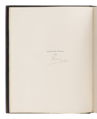 Large 4to (325 x 258 mm). 15 half-page engraved illustrations after Picasso (very minor dampstain on final blank leaf, lacking the additional suite of plates.) 20th century black morocco gilt, spine in 5 compartments with 4 raised bands, top edge gilt; original wrappers bound-in (minor rubbing to spine bands); slipcase.