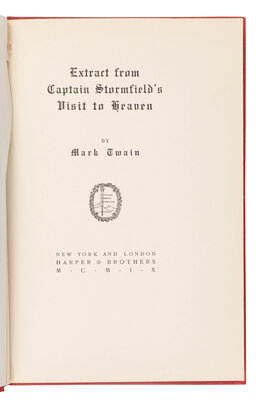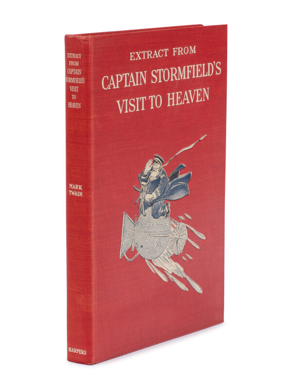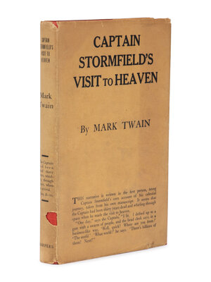 FIRST EDITION OF THE LAST BOOK PUBLISHED IN TWAIN'S LIFETIME IN THE RARE DUST JACKET. Extract from Captain Stormfield's Visit to Heaven was originally published in Harper's Magazine in December 1907 and January 1908, although it is believed to have been written nearly forty years earlier; Twain himself would describe it as a parody of The Gates Ajar, a very popular 1868 novel by Elizabeth Stuart Phelps Ward. BAL 3511.