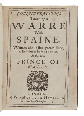 FIRST EDITION. Certaine Miscellany Works marks the first appearance of three of the four tracts included herein: Considerations Touching An Holy Warre with Spaine, An Offer to Our Late Soveraigne King James..., and The History of the Raigne of King Henry the Eighth. The first tract in particular attracted a firestorm of controversy for its vehemently militaristic appeal for Britain to go to war against Spain. Writing in the preface (not present here), editor William Rawley criticized Bacon's essay as a "corrupt and surreptitious edition." This edition nonetheless represents the only version of this work printed in the 17th century. ESTC S100333; STC 1124.