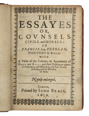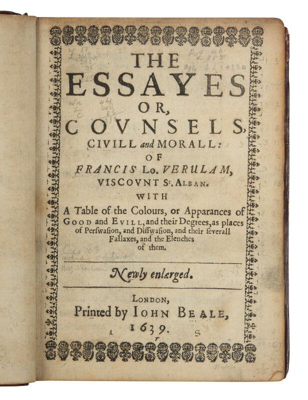 2) The Essayes or Counsels, Civill and Morall...with a Table of the Colours, or Apparances of Good and Evill...Newly enlarged. London: John Beale, 1639. Contemporary full calf (old repairs to hinges reattaching covers). Second edition, the suppressed Beale edition. ESTC S100372; Gibson 17; STC 1151.