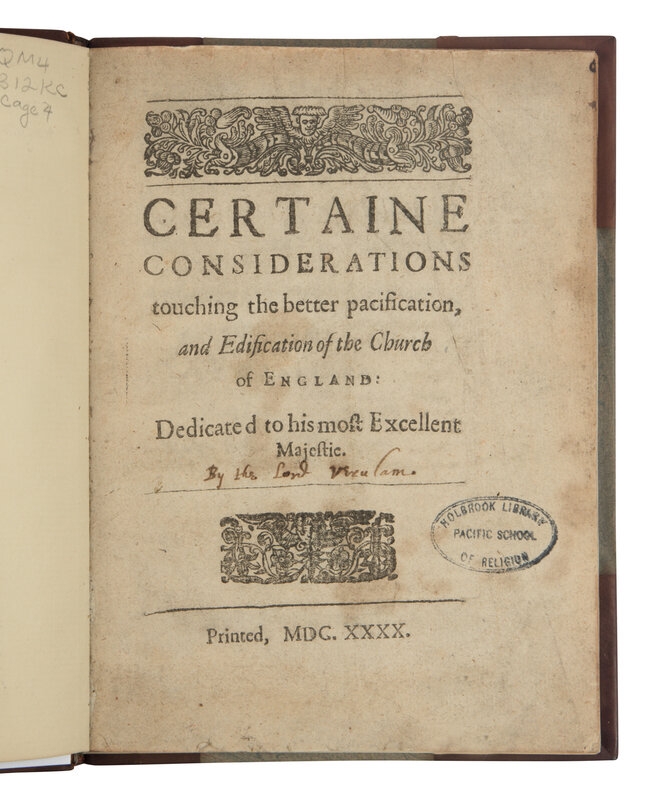 3) Certaine Considerations Touching the Better Pacification, and Edification of the Church of England. [London: Printed by T. Coates], 1640. 20th century half calf with marbled boards (rubbing). ESTC S101536; Gibson 77; STC 1123 (revised edition).