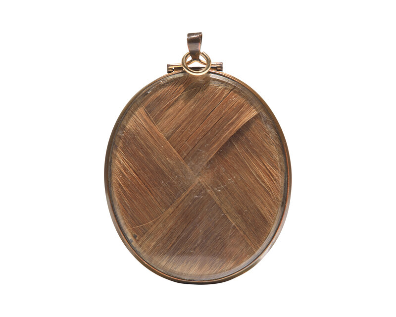 signed and dated, "Anna C Peale/ 1820", l.r., reverse with woven hairwork, watercolor, gilt metal pendant case with gilt and blue glass border.