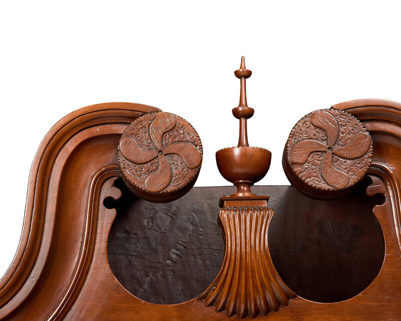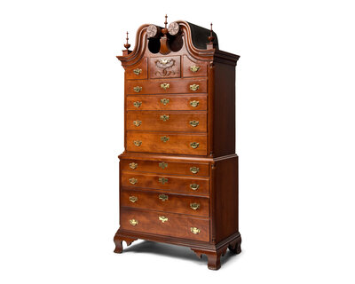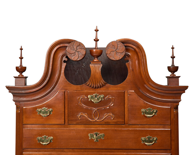 in two parts, the upper section with broken arch pediment with carved "pinwheel" volutes, and having three turned steeple-form finials, over three short drawers, the center short drawer with carved leafage, over four graduated long drawers, the lower section with waist molding, over four graduated long drawers, on molded base with ogee feet.