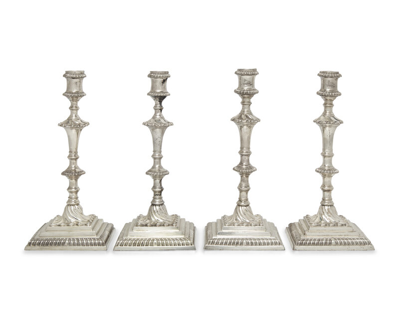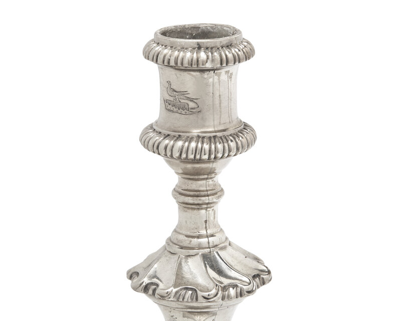 comprising a pair by Ebenezer Coker, London, 1769, marked, bearing accession number, "83.9"; and a pair by William Cafe, London, 1771, the candle cups engraved with an armorial crest in the form of a dove, marked, bearing accession number, "83.8."