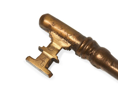 engraved with initials, "BA", housed in cardboard box with note to interior inscribed, "To: Brooke Astor/ This key to the Old Merchant's House is given/ that its premises be always open to her/ Without Brooke Astor the House could not have/ been finished and its historic interiors lost from the City."