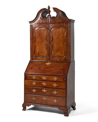 in two parts, the upper section with broken arch pediment centered by turned finial, over two paneled doors revealing storage compartments, the lower section with molded top over slant front revealing fitted interior, over a series of four graduated long drawers, on molded base with ogee feet.
