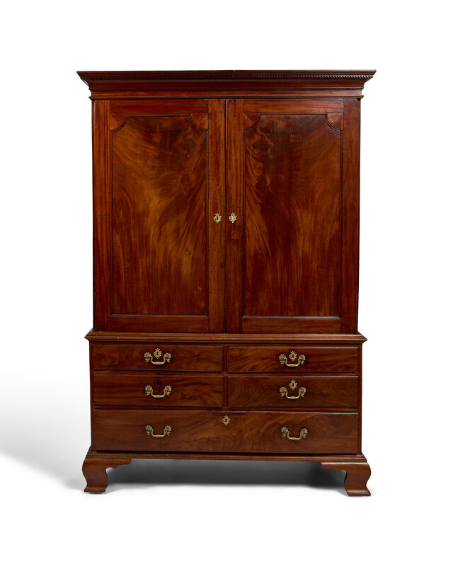 in two parts, the upper section with dentil carved cornice, over two paneled doors revealing clothing drawers, the lower section with waist molding, over series of four short drawers above long drawer, molded base on ogee feet.