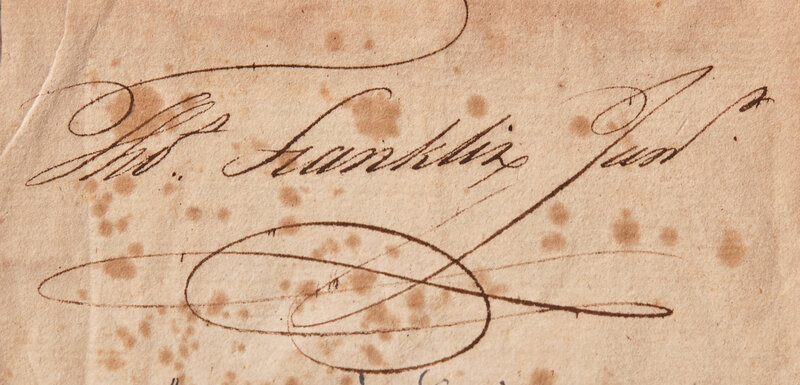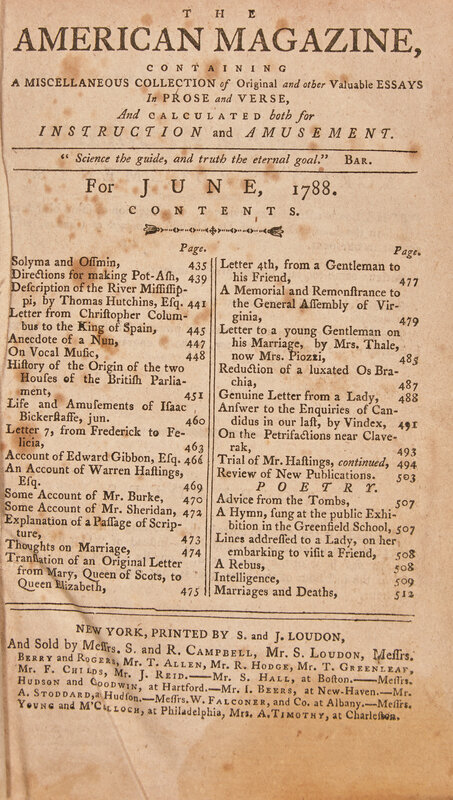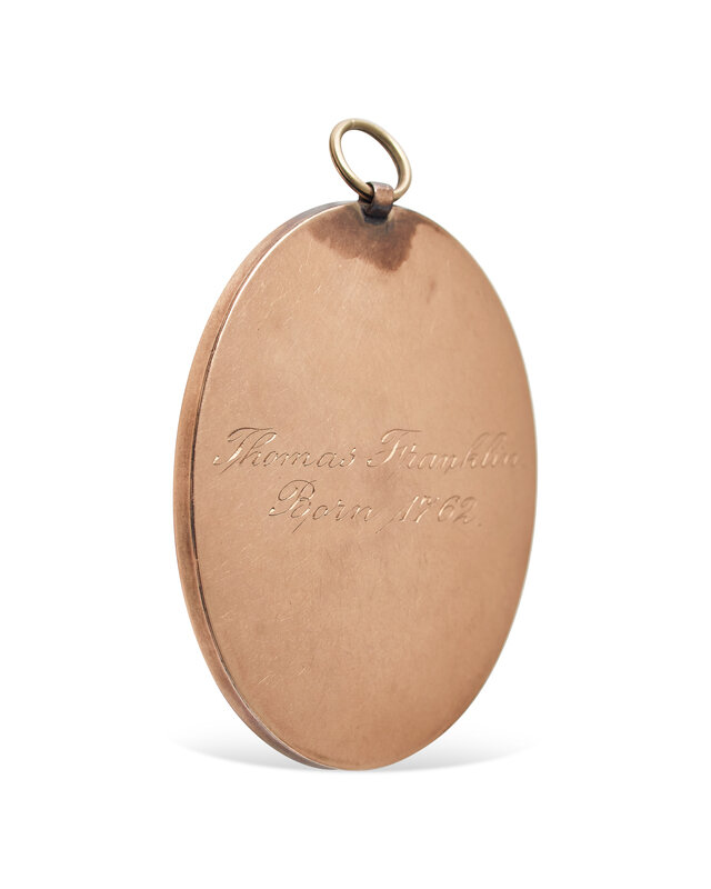 the gilt locket case engraved on verso, "Thomas Franklin/ Born 1762," watercolor, together with a volume of The American Magazine: Containing A Miscellaneous Collection of Original and other Valuable Essays in Prose and Verse..., New York, June 1788 to November 1788, pp. 435-882, in original leather binding and inscribed with signature, "Thos Franklin Junr," followed by later inscriptions, "Amelia F. Smith, daughter/Mary F. Smith-grand daughter/Russell S. Cox, son of M/ Margorie Cox Hook-daughter of R."