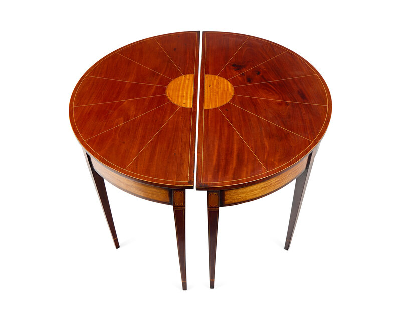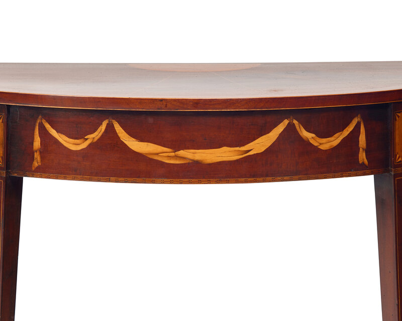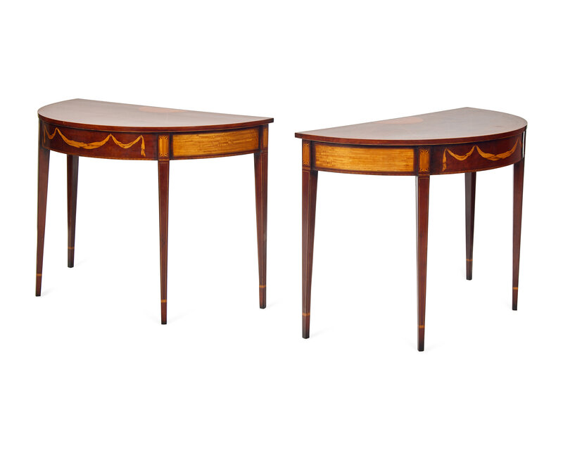 A Fine Pair of Federal Demilune Inlaid Mahogany and Satinwood Console Tables