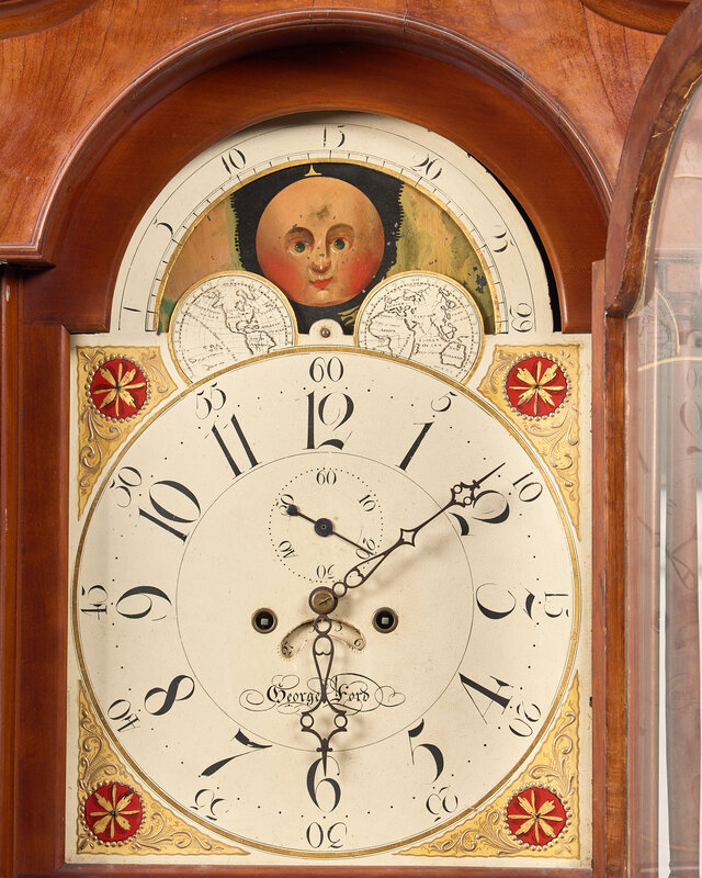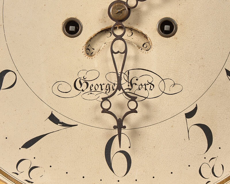 the hood with broken arch pediment with volute terminals, surmounted by three turned finials, the enamel face inscribed, "George Ford", with rosettes to spandrels and moon face dial, the case with rectangular crossbanded door, canted and reeded corners, on crossbanded and bookmatched base with shaped apron and French feet, the case interior with old chalk inscription, "Lancaster County 1814".
