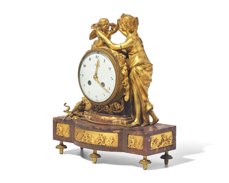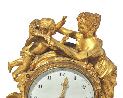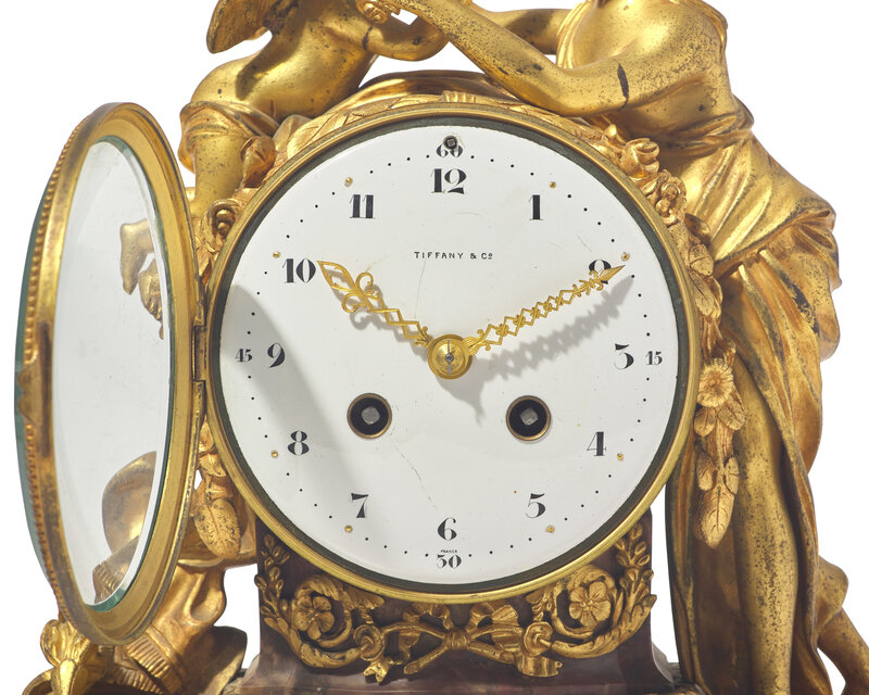 the bronze mounts depicting Aphrodite and Cupid, the frieze with reveling putti, with enamel dial marked, "Tiffany & Co./ France," the back of the marble base incised "FRANCE," the works marked, "Medaille D'Or/ Samuel Marti/ Paris 1900," "Made in France," "4514," and "A.1."