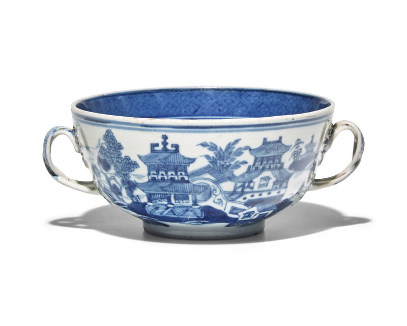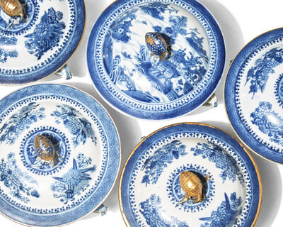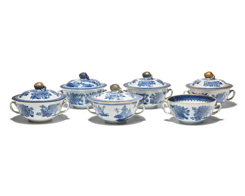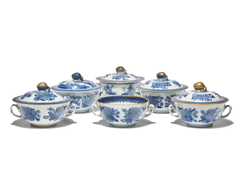 A Group of Six Chinese Export Porcelain Blue Fitzhugh Double-Handled Bowls with Five Covers