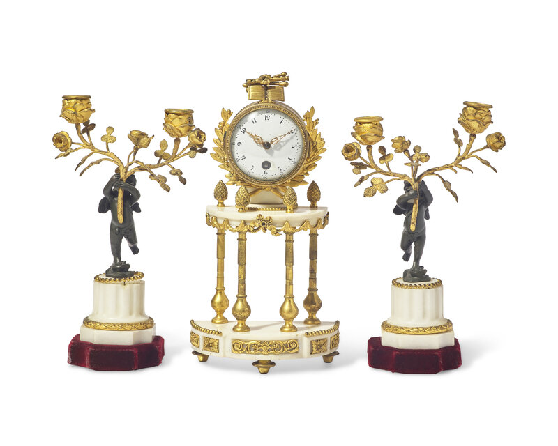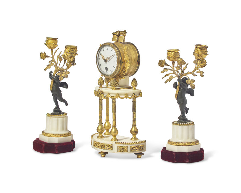 A Louis XVI Style Gilt and Patinated Bronze Mounted White Marble Three-Piece Clock Garniture