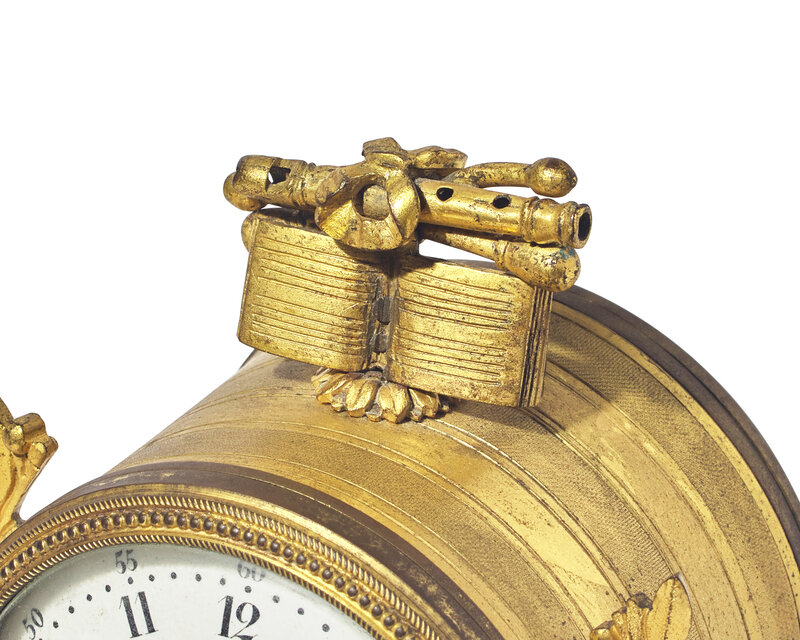 Height 12 x width 6 1/4 x depth 3 1/8 inches (clock), Height 11 1/2 x width 6 1/4 x depth 3 3/4 inches (candlesticks including bases, overall).