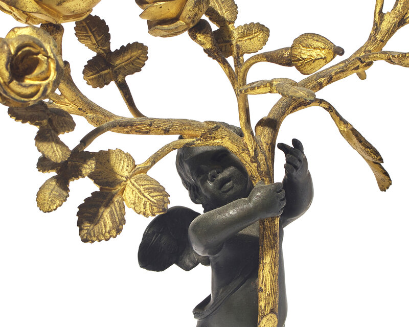 comprising a clock with enamel dial, and two candlesticks in the form of putti holding rose sprigs, on velvet wrapped bases.