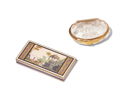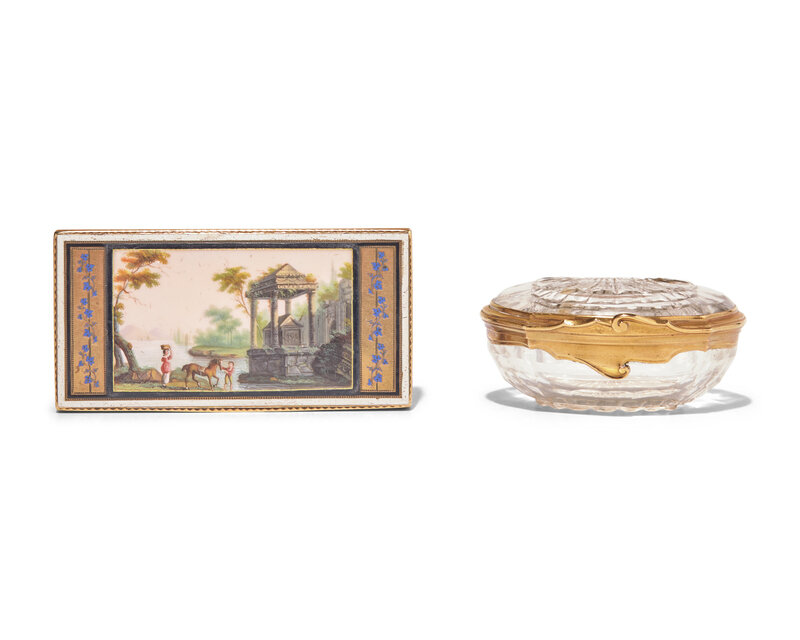 comprising a French 18 Karat gold-mounted cut crystal shell-form snuff box, post 1838, the rim struck three times, including twice with standard mark in the form of eagle head facing right; and a rectangular gold and enamel snuff box, German, circa 1800, the lid with figures and horse in a landscape with ruins against an opalescent pink sky, the interior well and lid each struck with sunburst between three sprigs, the right-facing edge of lid impressed "3419."