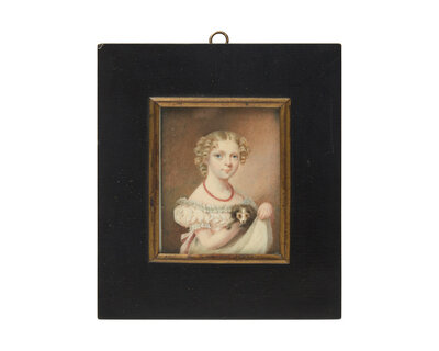 American School 19th Century, A Portrait Miniature of a Young Girl Holding a Dog