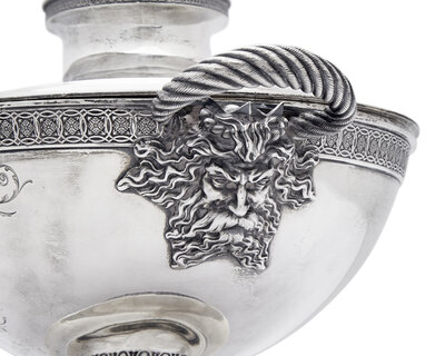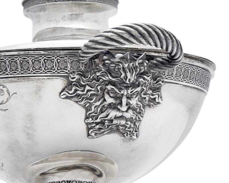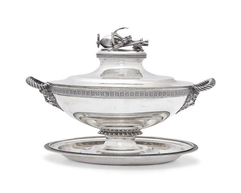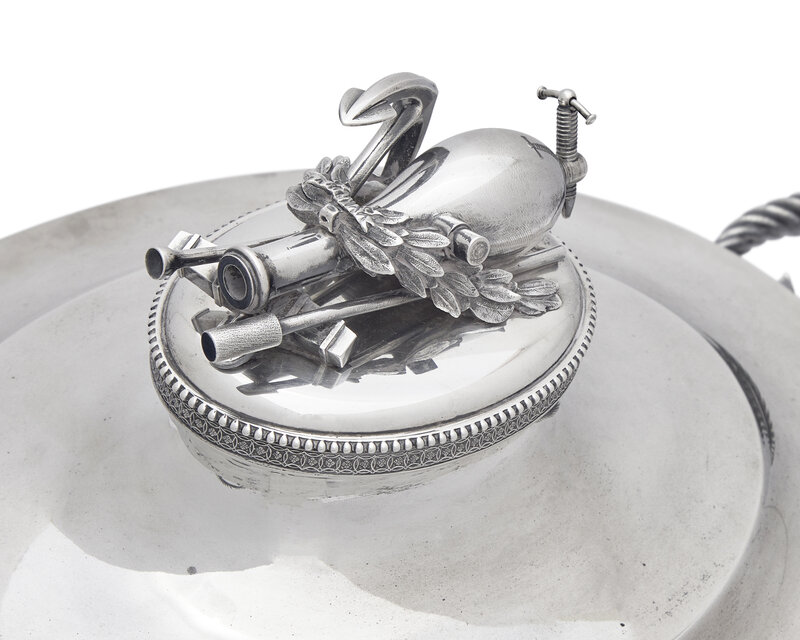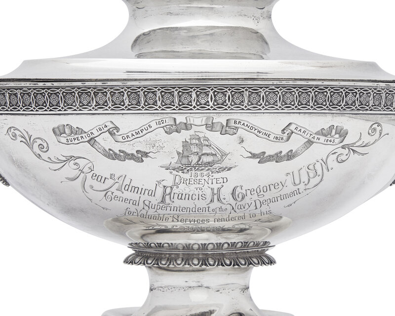 the tureen with beading, egg-and-dart molding, and Neoclassical cast frieze to edges and rims, with two rope-form handles surmounting cast masques, the lid topped by finial in the form of panoply of naval accoutrements, including cannon, rammer / sponge, anchor, and laurel garland, the body engraved with naval ship with banner above inscribed with ship names and build dates, "Superior 1814", "Grampus 1821", "Brandywine 1828", and "Raritan 1845", all over inscription, "Real Admiral Francis H. Gregorey [sic] U.S.N./ General Superintendent of the Navy Department/ for Valuable Services rendered to his/ Country", marked to undersides, including mark indicating J.C. Moore & Son, maker (1854-1869).