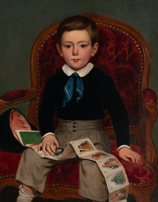 French School 19th Century, A Portrait of a Seated Boy Holding Alphabetic Saint Booklet